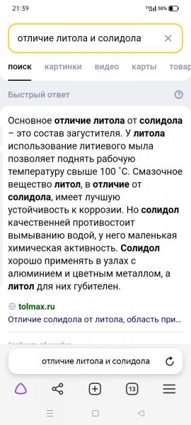 B.V.A 4 650 Опубликовано 24 июля, 2023 (изменено) Алексей с Тихвина знает мужыка с погонялом Солидол).. он типа всё им мажет и даже его чуть не на хлеб.. ну если с буквой Ж то вроде можно).. У солидолов С или Ж плюс (только) в том от литола он же циатим 203 что он (солидол) трудновымываем.. тоесть он жирнее чем литол.. В остальном во всем литол лучше.. И солидол в редуктора идёт по старинке, и только в оч малооборотистые.. и присадок от износа нет (вроде).. А так по идее чем чаще мажешь тем лучше, для шкворней эт важно.. солидол или литол по идее пО барабану.. я раньше всегда литолом мазал и норм.. эт щас синие красные и другие цветные и типа крутые смазки, но по идее если для шкворней то ты только денежку переплачиваешь.. Надо боольшую банку ведро литола купить.. точнее подешевле на Авито выцепить.. Да , а по холодной зиме литол мешать можно с трансмисионкой, без фанатизма чуть чуть.. нО! только с джиэль чеПыре, тм 4.. Ну и еще немного про солидол).. антикоррозийная у его никакая по сравнению с литолом.. так же и по присадкам.. Вывод, каждый дроч..т как хочет.. Изменено 24 июля, 2023 пользователем B.V.A Поделиться сообщением Ссылка на сообщение Поделиться на другие сайты