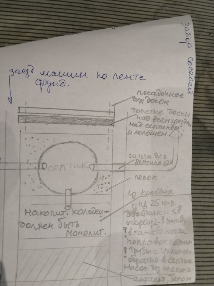 вилли 944 Опубликовано 19 декабря, 2024 Думаю так сделать Совместить заезд для авто ввиде ленты, с фундаментом для септика с колодцем Места мало свободного, подумал почему бы машину над септиками нне ставить.. Но чтоб доступ к ним легкий был. Доски как тиро над смотровой, защитят конструкции от случайного сьезда машины, их всегда легко убрать. Последний колодец из колец делать нн вариант - он все равно талую воду со временем запускать начннт - лучше целиком отлить. Вот и получилось 2 в 1.Отлить же можно чтоб герметично? Важно еще чтоб плоская поверхность получилась, снег убирать легче - и лопатой, и отвалом Поделиться сообщением Ссылка на сообщение Поделиться на другие сайты