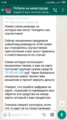 Toyota007 2 890 Опубликовано 5 июля, 2019 Новая схема развода, за которую вас могут посадить как соучастника!Сейчас мошенники придумали новый вид развода, по этой схеме вы становитесь соучастником преступления и вас могут привлечь к ответственности по статье!Схема которую используют мошенники такова, к вам на карту поступает крупная сумма средств 70 000-80 000 руб. Через буквально несколько минут звонит вам мошенник и просит вернуть деньги.Говорит, что ошибся цифрами на карте, пожалуйста переведите мне обратно эти средства на номер карты который я вам продиктую.Сначала говорит культурно, если что то идет не по плану начинает хамить и угрожать. Обычно люди порядочные, возвращают деньги на номер карты которую продиктовал мошенник, тем самым становясь соучастником преступления. Еще мошенники говорят за беспокойство оставьте себе на карте 10 000- 20 000 руб.Откуда же пришли деньги спросите вы? Мошенник продает в интернете не несуществующей товар, просит покупателя перевести деньги на вашу карту, нечего не подозревающий покупатель переводит.После мошенник звонит вам и говорит что ошибся в цифрах, прошу верните деньги обратно, ну и оставьте чуть-чуть себе за беспокойство.Получается в этой схеме вы 3 звено, сами того не понимая. Так как покупатель(которого обманули) думает что деньги получили вы! И заявление он в полицию пойдет писать на имя держателя карты, на которую переводил деньги.Откуда у мошенников номер вашего телефона и карты? Скорее всего были куплены в интернете у нечестных сотрудников банка, которые продали базу клиентов.Что же делать в таких случаях? Позвонить в банк и попросить вернуть деньги отправителю.Обязательно поделитесь этой статьей с друзьями, чтобы не попались на удочку злоумышленников .Будьте бдительны и аккуратны! Всех благ и не обжигайтесь. 10 Поделиться сообщением Ссылка на сообщение Поделиться на другие сайты