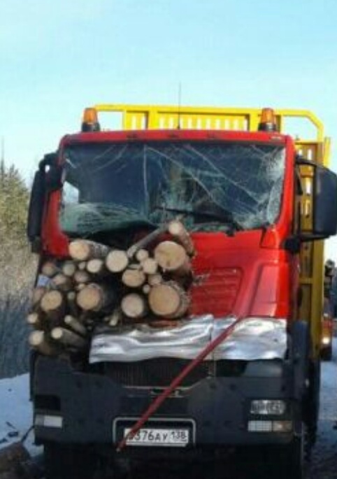 Водителю этого грузовика невероятно повезло, он отделался лишь испугом, а вот машине досталось по полной. Бревна слетели из впередиидущего лесовоза и угодили в кабину второму автомобилю.