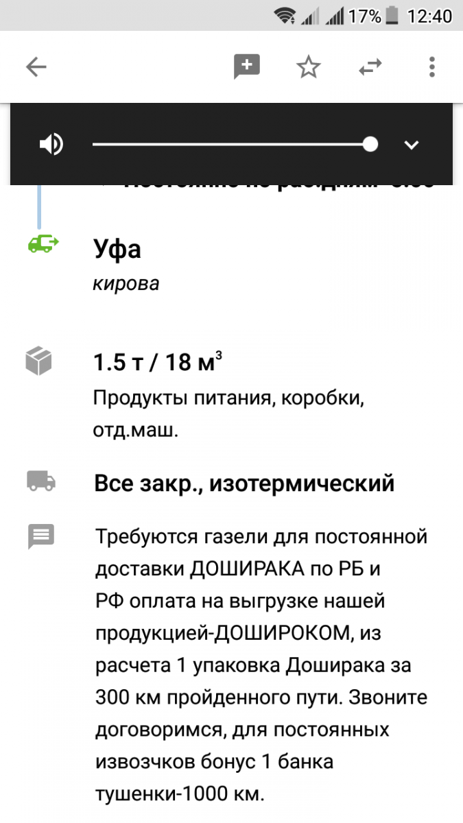sergey.62 134 Опубликовано 21 декабря, 2018 (изменено) Посмотрите,пожалуйста Алабино-Рязань 0,8/-ТНПhttp://loads.ati.su/#?filter=%7B"exactFromGeos":true,"exactToGeos":true,"weight":%7B"to":"2"%7D,"volume":%7B"to":16%7D,"dateOption":"manual","fromGeo":"2_1297","from":"Алабино,%20Московская%20обл.,%20РФ","toGeo":"2_206","to":"Рязань,%20РФ","fromGeo_tmp":"2_8411","toGeo_tmp":"1_8"%7Dвсе отбой, вышел на грузополучателя, она в курсе про АТИ, и пока вежливо послала меня, с моей ставочкой :) :angry: Изменено 21 декабря, 2018 пользователем sergey.62 Поделиться сообщением Ссылка на сообщение Поделиться на другие сайты